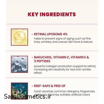 مشاهده کامل- 4٪ رتینال لیپوزوم: نسخهای پایدار از ویتامین A که به تحریک تولید کلاژن و کاهش چین و چروک کمک میکند. برخی کاربران گزارش دادهاند که این فرمول نسبت به رتینول معمولی کمتر باعث تحریک میشود.