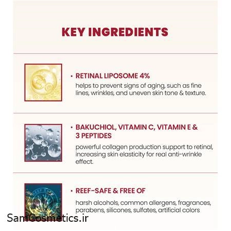 آب، گلیسیرین، رتینال لیپوزوم (4٪)، عصاره تخمیر شده لوبیا سویا، پانتنول، نایاسینامید، سرامید NP، هیالورونیک اسید، باکوچیول، ویتامین C و E، سه نوع پپتید، عصاره ریشه جینسینگ، عصاره ریشه سیبزمینی، عصاره ریشه گیاهان مختلف و سایر ترکیبات فعال.